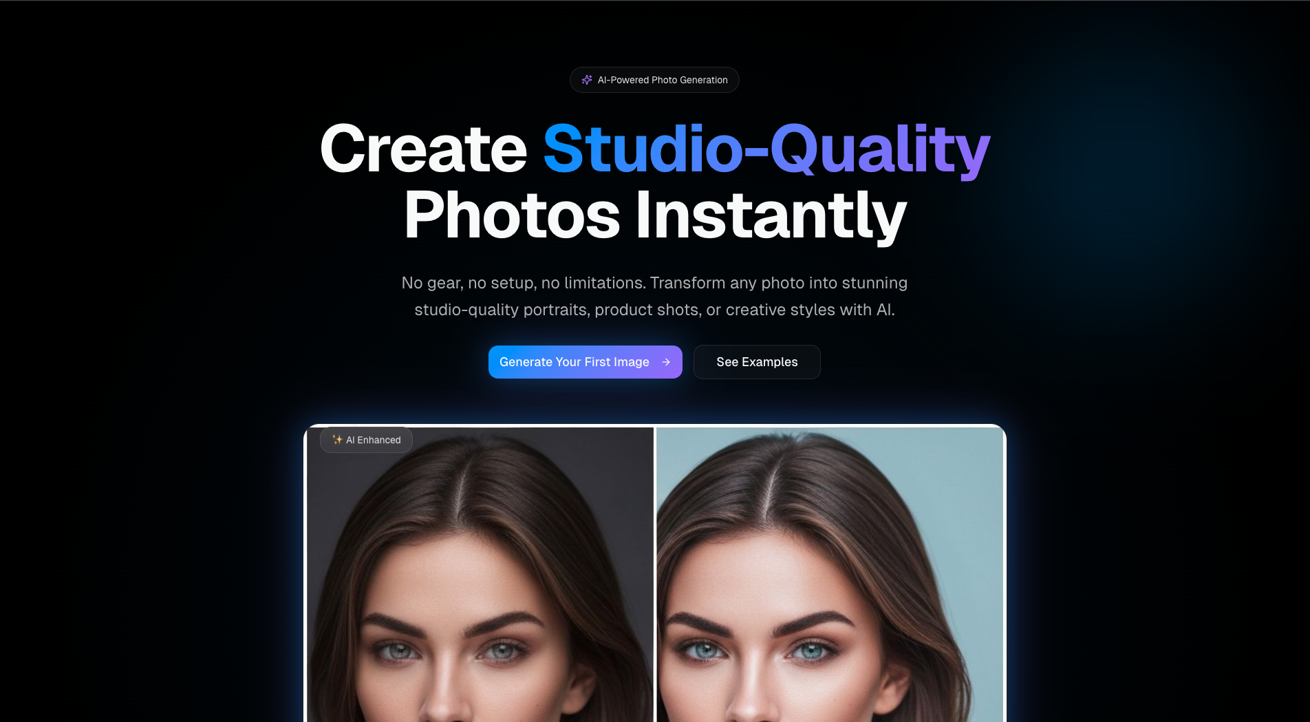 A visually rich landing page for an AI-powered photo generator that produces studio-quality images from simple uploads. Designed with artistic gradients, cinematic visuals, and a premium product feel.